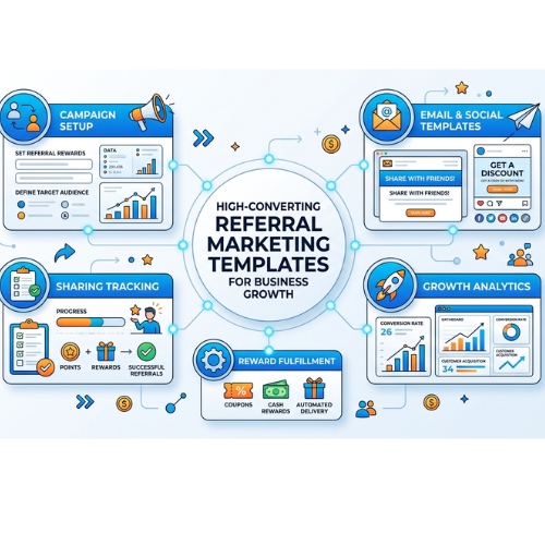 Referral marketing templates are pre-designed systems, scripts, and frameworks that help businesses encourage their existing customers to refer new customers. Instead of building everything from scratch, these templates give you a ready-to-use structure that works.